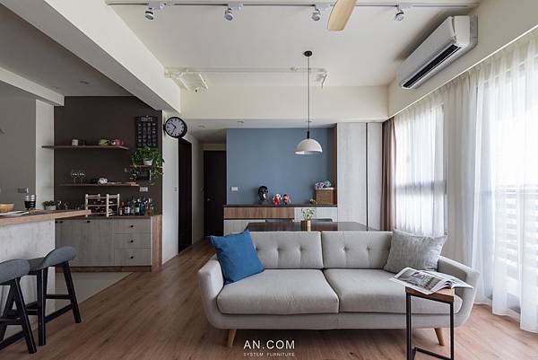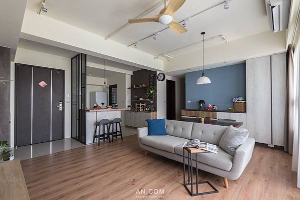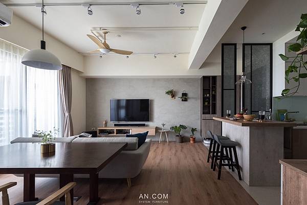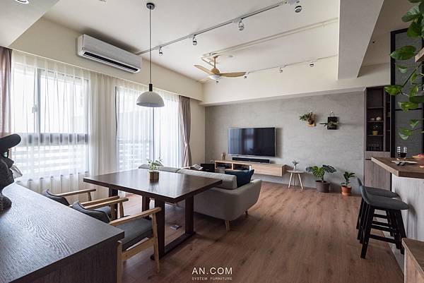 想要多享受兩人時光,因此決定盡量放大公共空間為主軸。利用簡單的線條、暖色調及木地板,加上綠意。一個自然、舒服帶點紋理的療癒空間就誕生了。