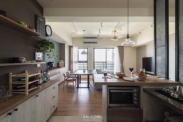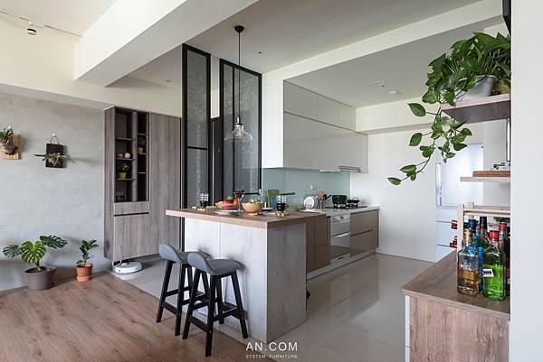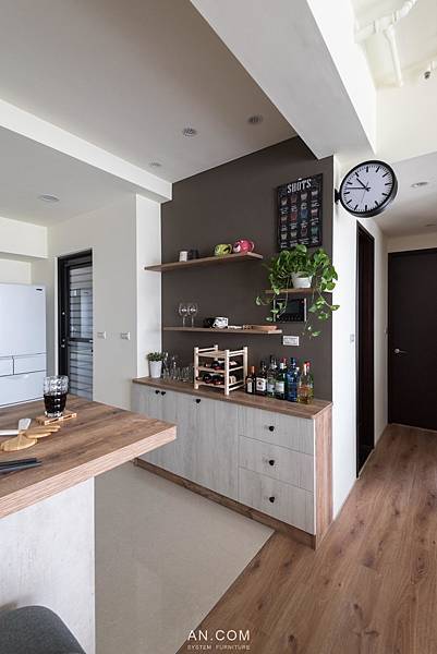 太太平時就喜歡手做一些甜點、烘焙,再加上先生有調酒的興趣,依此開放性廚房及吧台式餐桌的設計,最適合朋友來訪展現自己拿手一面的地方了。一個雜貨風格的角落,帶出屋主熱愛生活的痕跡。藉由美食,多點話題與興趣,增添生活情趣。