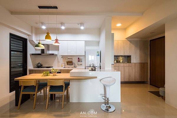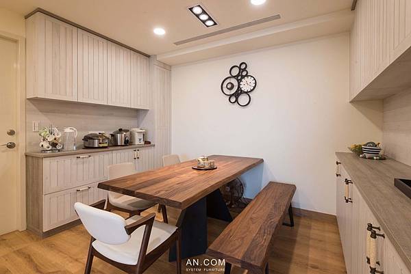 以白色的清爽為主色調,選擇純白或是帶點輕微紋理的白橡木系統櫃面板,整體空間乾淨,就如同圓圓滿滿Q彈白玉的模樣,耐人尋味喔~